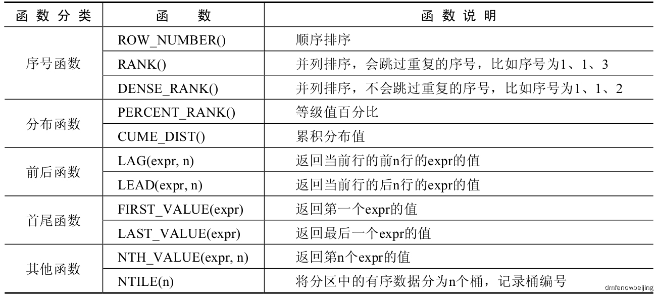 注意:读者也可以到MySQL官方网站了解窗口函数的使用,MySQL官方网站窗口函数的网址为https://dev.mysql.com/doc/refman/8.0/en/window-function-descriptions.html#function_row-number。