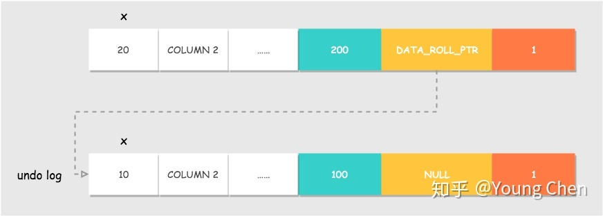 DATA_TRX_ID为修改记录的事务ID,将DATA_ROLL_PTR指向刚刚拷贝到undo log链中的旧版本记录,这样就能通过DB_ROLL_PTR找到这条记录的历史版本。如果对同一行记录执行连续的UPDATE,Undo Log会组成一个链表,遍历这个链表可以看到这条记录的变迁 - 记录