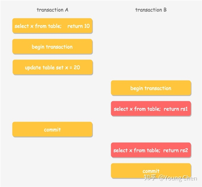 Dirty Reads):一个事务正在对一条记录做修改,在这个事务并提交前,这条记录的数据就处于不一致状态;这时,另一个事务也来读取同一条记录,如果不加控制,第二个事务读取了这些尚未提交的脏数据,并据此做进一步的处理,就会产生未提交的数据依赖关系。这种现象被形象地叫做 “脏读”。 - 不可重复读(