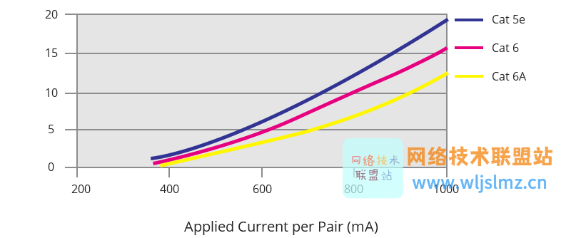 4 对 PoE 使可用功率翻了一番,使 PoE 能够扩展到支持更高功率的设备,而不是仅限于需要低功率(如 15W 或 30W)的设备。然而,高功率并不是 PoE 布线中唯一需要注意的问题。热量上升是另一个。制造商和技术联盟一直致力于评估通过 4 对 PoE 提供 100 瓦功率的热影响。显然,增加的功率会增加电流,这会显着导致电缆发热增加。