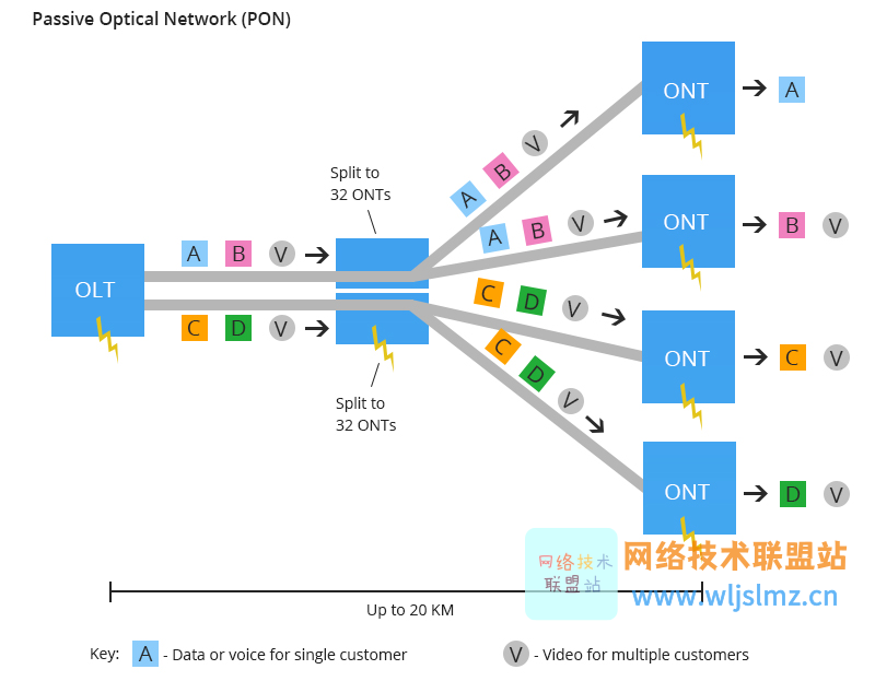 正如其名称所示,PON 网络不包括电动交换设备,并为部分网络共享光纤束。只有在信号的源端和接收端才需要有源设备。