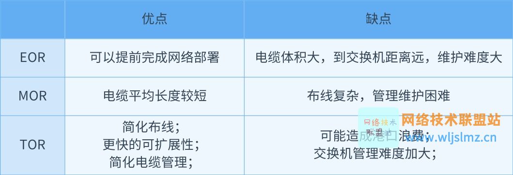 TOR布线方式简化了服务器机柜与网络机柜之间的布线,每个服务器机柜到EOR/MOR网络机柜的光纤或铜缆数量较少(4-6根)。