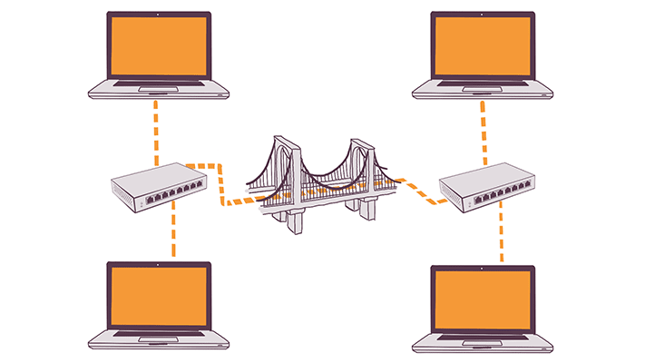 另一种设备是网桥。L2 网桥用于连接两个使用交换机形成的网络,如下所示: