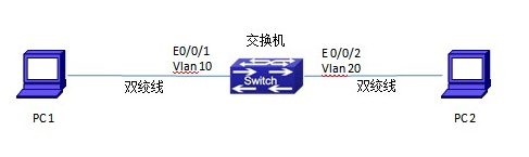 PC1和PC2分别连接到交换机的端口E 0/0/1和E 0/0/2,端口分别属于Vlan 10和Vlan 20。