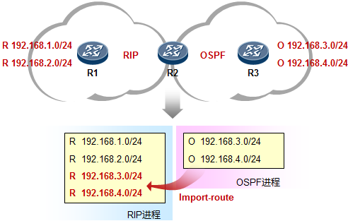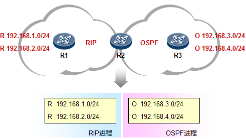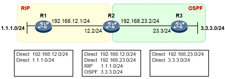 上图是初始状态。R2分别从RIP及OSPF都学习到了相应的路由。但是在默认情况下,通过这两个路由协议所学习到的路由是互相隔离的,R2不会自动的将OSPF路由“翻译”成RIP,反之亦然。那么此时,R1自然是无法访问到R3这一侧的网络的,R3也是一样。