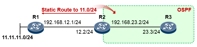 在上图中,R1直连着网络11.11.11.0/24,R1不支持动态路由协议,R2配置了去往11.11.11.0/24的静态路由,且下一跳为R1。R2与R3建立OSPF邻接关系。现在对于整个OSPF域而言,它们是感知不到11.11.11.0/24网段的存在的,因为对于OSPF而言,R2所配置的静态路由是一条域外的路由。为了让OSPF内的路由器能够通过OSPF学习到11.11.11.0/24路由,我们需要在R2上部署路由重发布,将静态路由重发布到OSPF: