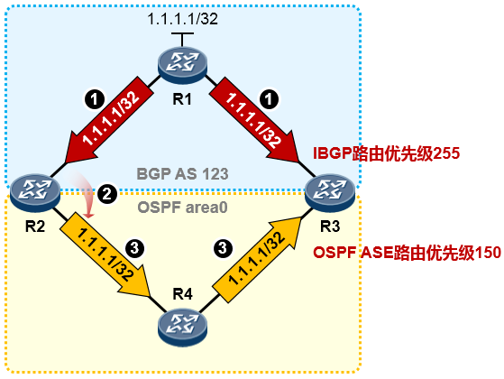 还是上面的环境,刚才我们已经分析过了,如果不做任何干预,R3是会存在次优路径问题的,因为R3会优选到达1.1.1.1/32的OSPF路由,而不是IBGP路由。而如果R3又部署了OSPF到BGP的路由重发布,那么1.1.1.1/32路由又会被R3给倒灌回BGP,这就存在一个引发路由环路的隐患。