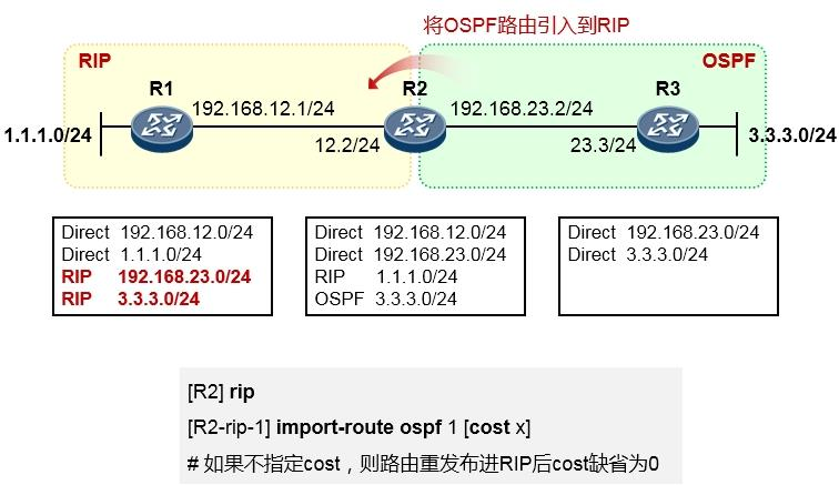 注意,上面只是给出了关键配置。完成这一步动作之后,R1的路由表就发生了变化,由于R2部署了从OSPF到RIP的路由重发布,因此它会将其路由表中的所有OSPF路由(3.3.3.0/24)以及本地直连的OSPF接口路由(192.168.23.0/24)都注入RIP,从而R1便能够通过RIP学习到192.168.23.0/24及3.3.3.0/24路由。