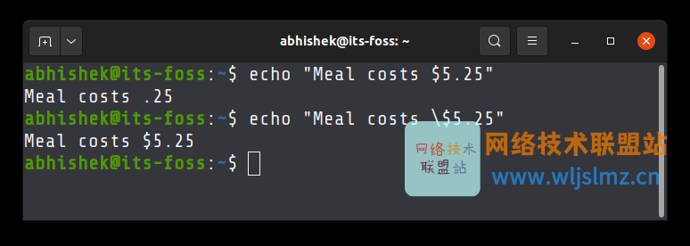 abhishek@its-foss:~$ echo "Meal costs \$5.25"