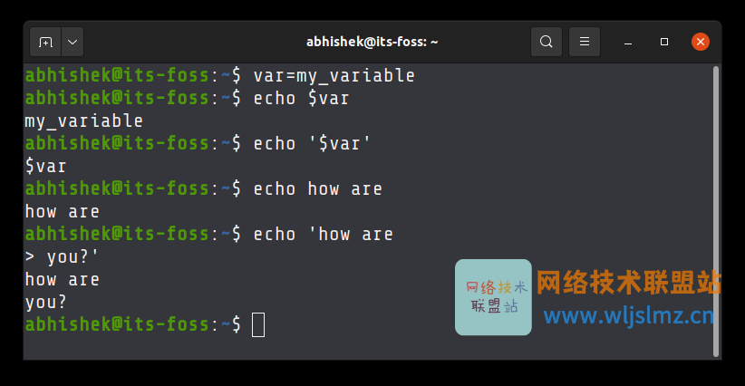 abhishek@its-foss:~$ var=My 'own villa' is yellow