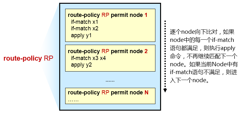 Route-policy是一个非常重要的基础性策略工具。你可以把它想象成一个拥有多个节点(node)的列表(这些node按编号大小进行排序)。在每个节点中,可以定义条件语句及执行语句,这就有点像程序设计里的if-then语句,如上图所示。
