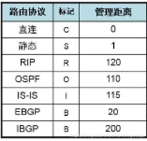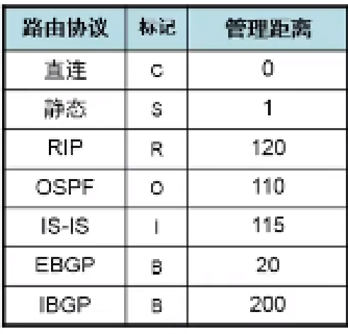 不同协议产生的路由有一个标识优先级的数字,称为管理距离,当不同的路由协议产生同一条路由(指的是子网号和子网掩码均相同时)管理距离小的路由条目优先。