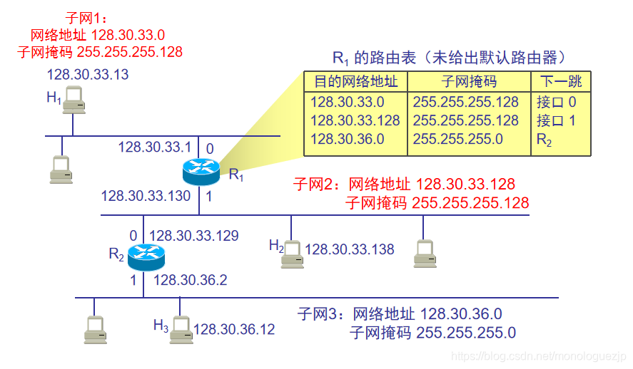 H1要与H2通信,数据报发至路由器R1时,查找R1的路由表。将目的IP依次与路由表中的子网掩码相与,发现主机H2的IP地址:128.30.33.138 与255.255.255.128相与后,落在了128.30.33.128网段上,因此路由器将数据包按照路由表指示,从1接口发出。