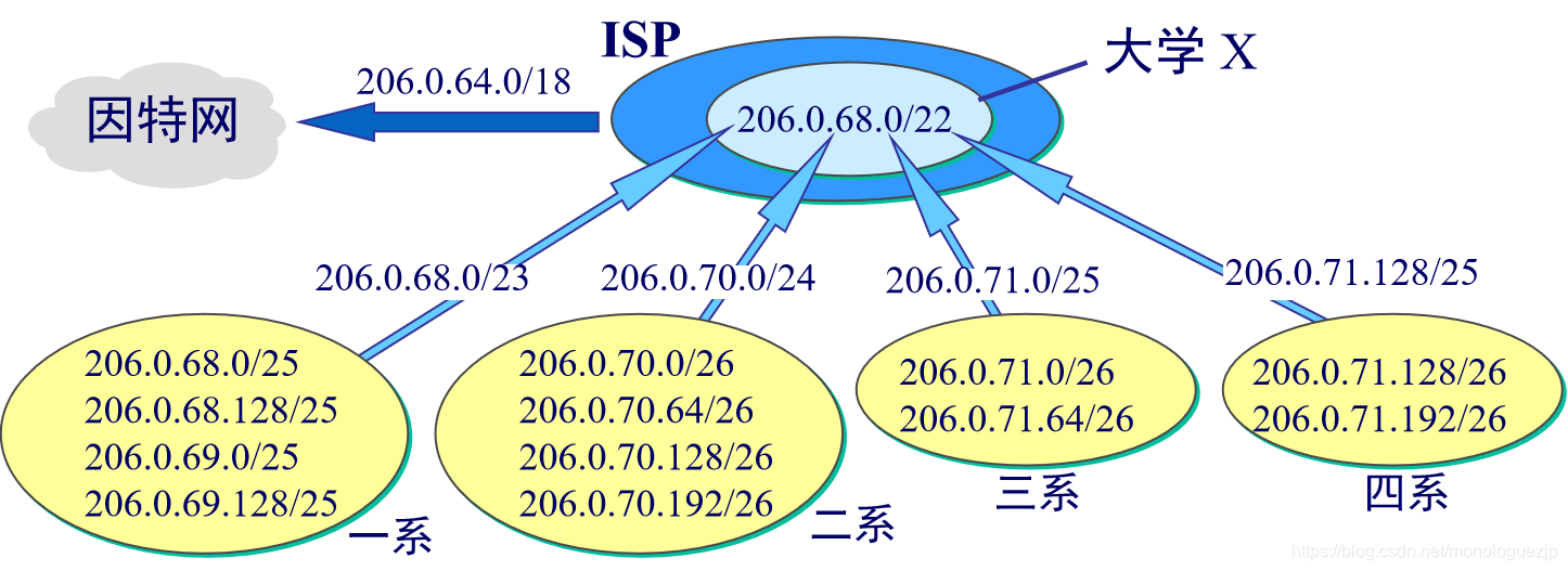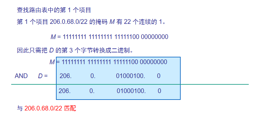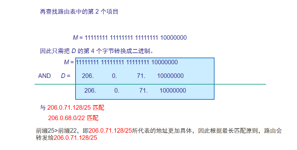 ISP收到一个目的地址 D = 206.0.71.128的分组,假设ISP中只有两条路由: