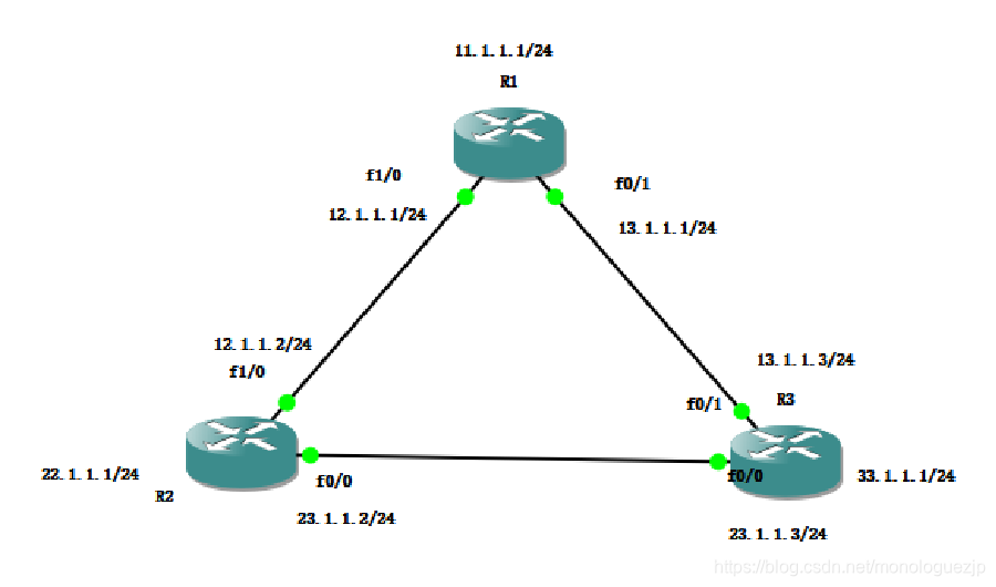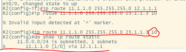 R2#:ip route 11.1.1.0 255.255.255.0 12.1.1.1 //默认优先级为1