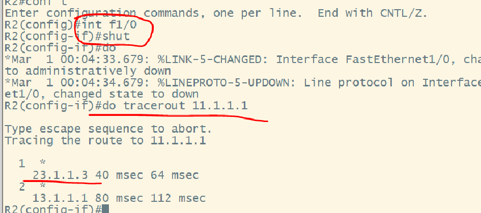 此时我们关闭这条路由信息对应的端口f1/0,再次进行tracerout命令,发现路由器选择了备份路由条目来作为转发依据。如下图: