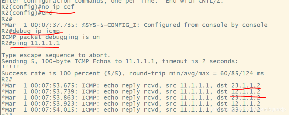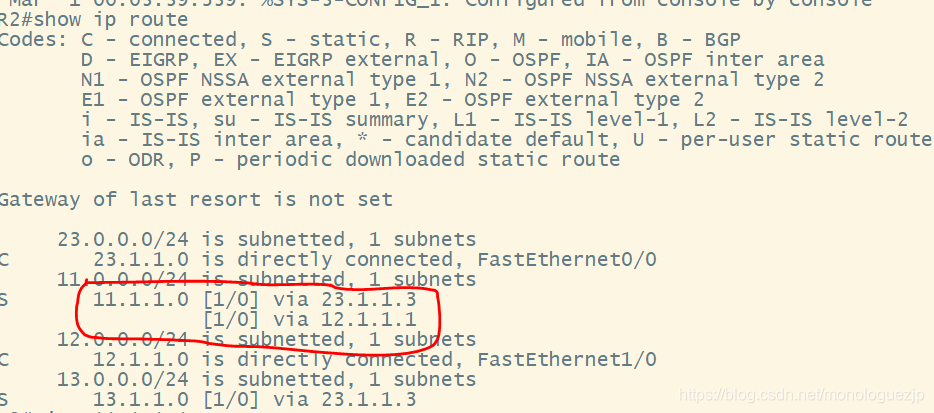 R2#:ip route 11.1.1.0 255.255.255.0 23.1.1.3 10 //优先级设置为10,备份路由
