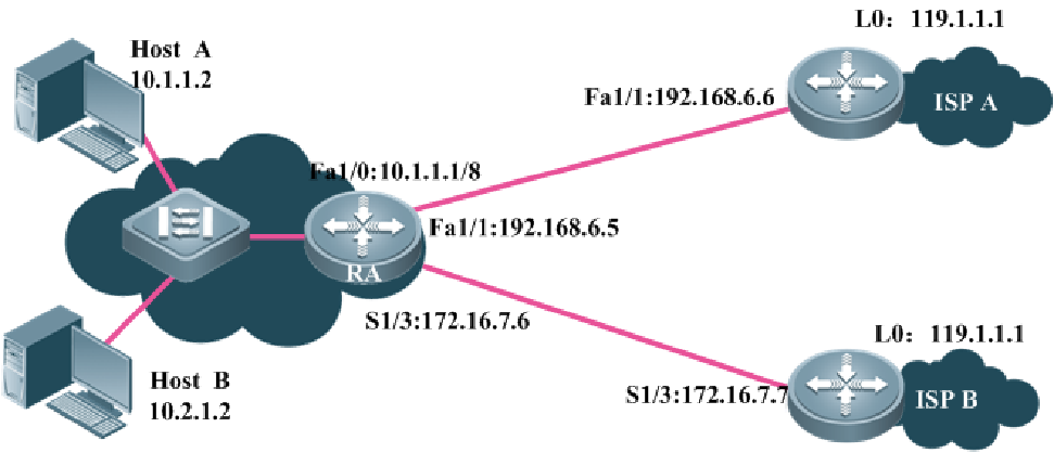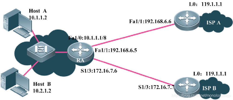 以上图为例进行配置,连接两家ISP时使用基于策略的路由选择
