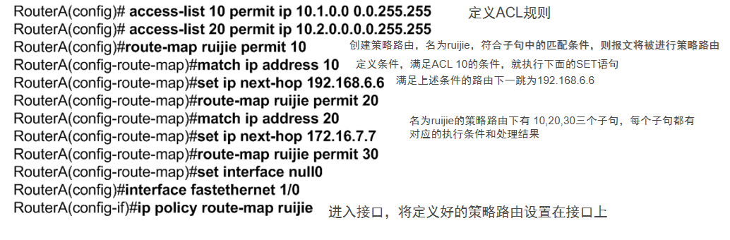 策略路由能满足基于源IP地址、目的IP址、协议字段,甚至于TCP、UDP的源、目的端口等多种组合进行选路。简单点来说,只要IP standard/extended ACL 能设置的,都可以做为策略路由的匹配规则进行转发。