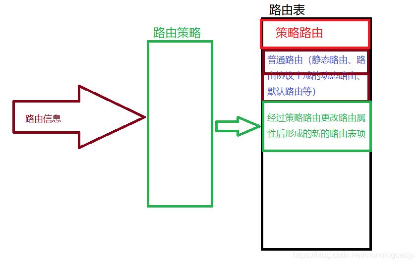 以下图直观的来说,路由策略只是更改了生成的路由表,不涉及转发;在转发时,有限考虑策略路由,在策略路由不满足的情况下,再去匹配下方普通的路由表项或者被路由策略该过的表项。