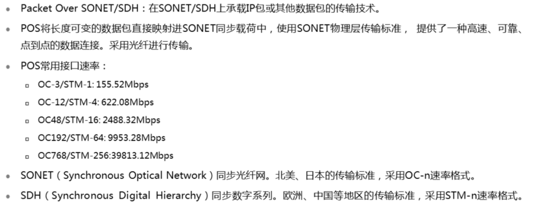 ●POS端口里采用PPP或HDLC的二层封装来承载IP ,二层报头开销最长9个字节,也可能是7个字节。而10G LAN和WAN都是以太封装,二层报头开销是18个字节。由此看出, POS接口对IP报文的传输效率更高。