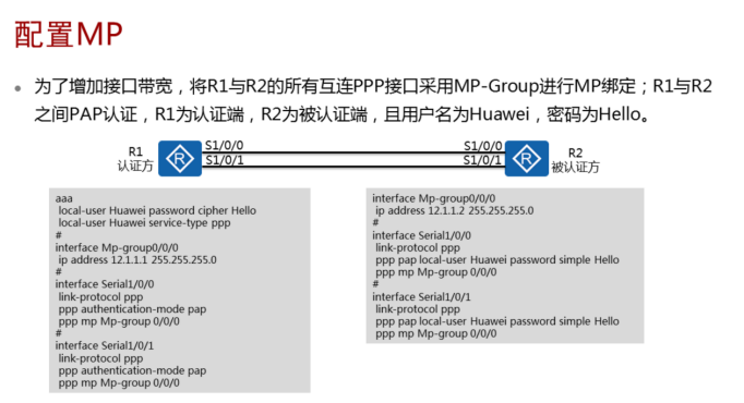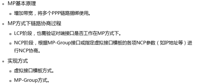 MP:MultiLink PPP允许将报文分片, 分片将从多个点对点链路上送到同一个目的地。