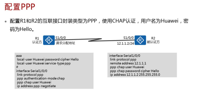 被认证方将配置的用户名和密码信息使用Authenticate-Request报文以明文方式发送给认证方,本例中,用户名为"huawei” , 密码为"hello" 。