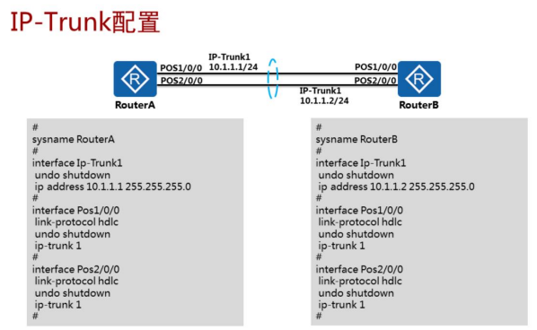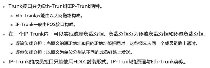 ●Trunk接口分 为Eth-Trunk和IP-Trunk两种。Eth-Trunk只能由以太网链路构成;IP-Trunk- 般由POS接口构成。