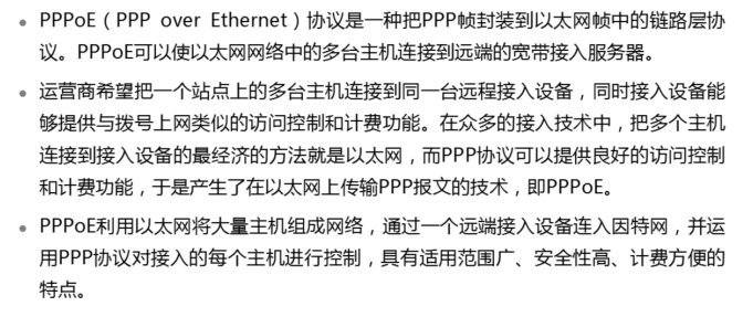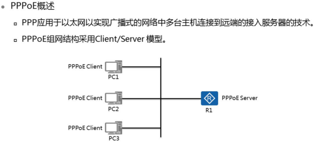 ●PPPoE概述:PPPoE利用以太网将大量主机组成网络,通过一个远端接入设备连入因特网,并运用PPP协议对接入的每个主机进行控制,具有适用范围广、安全性高、计费方便的特点。