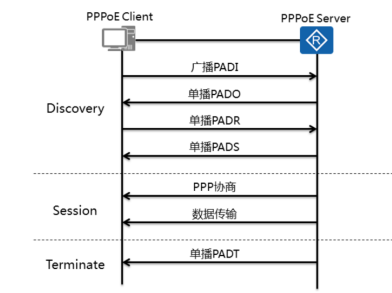 ●PPPoE可分为三个阶段 ,即Discovery阶段、Session阶段和Terminate阶段。