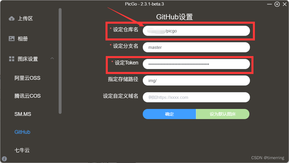 5.在picgo中把刚刚复制的部分粘在第一行设定仓库名中。