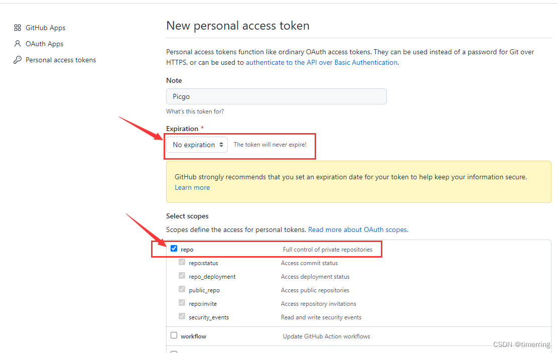 6.在Expiration中选择 no expiration保证token永远不会过期,防止再次配置的麻烦。