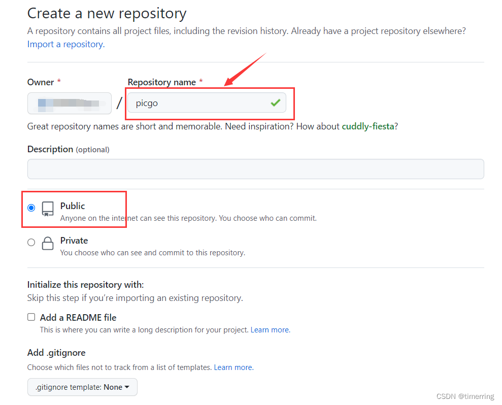 2.填写仓库名,并将仓库设置为Public公开,注意,一定要设置为公开,如果设置私有将无法访问。