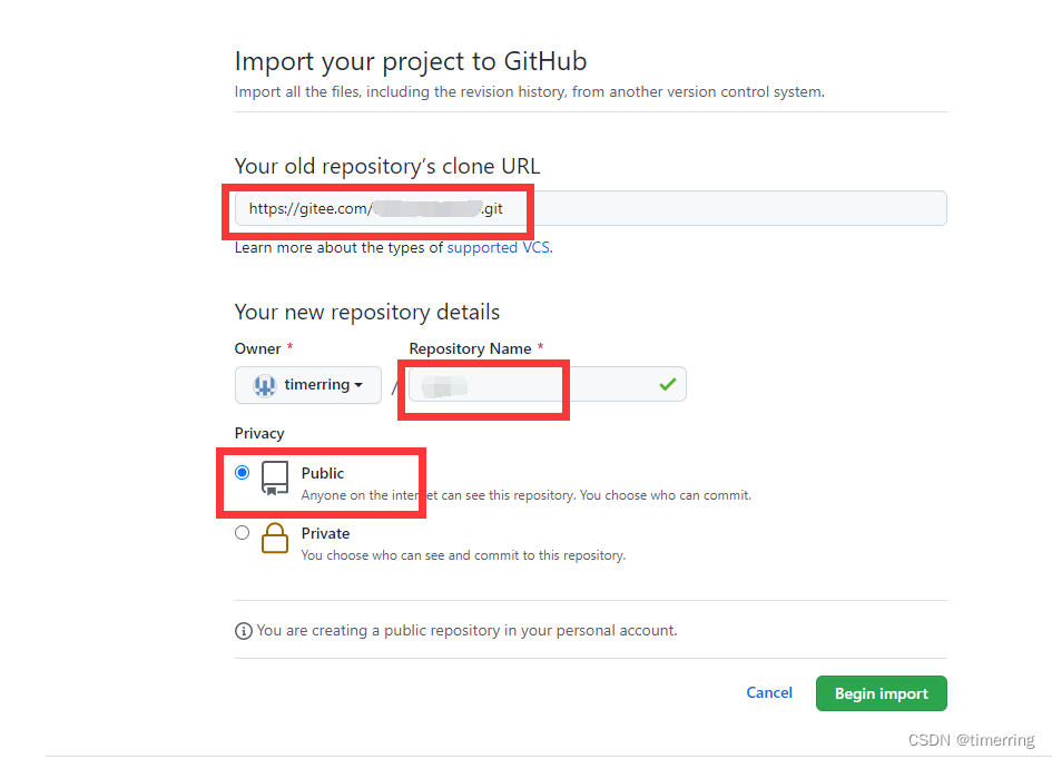 3.在导入仓库中,粘贴刚刚复制的gitee地址到old repository‘s clone URL中。在下面新起一个仓库名字,