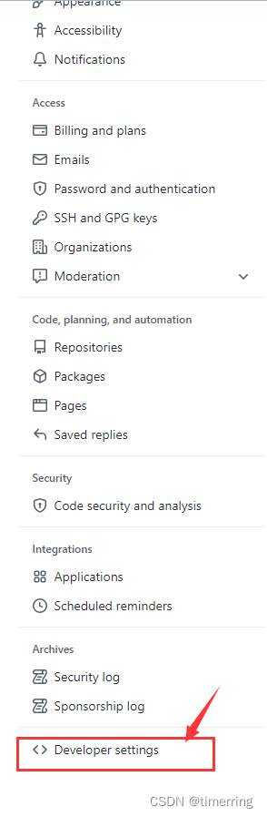 3.然后点击settings,在左侧的菜单栏中选择Developer settings。
