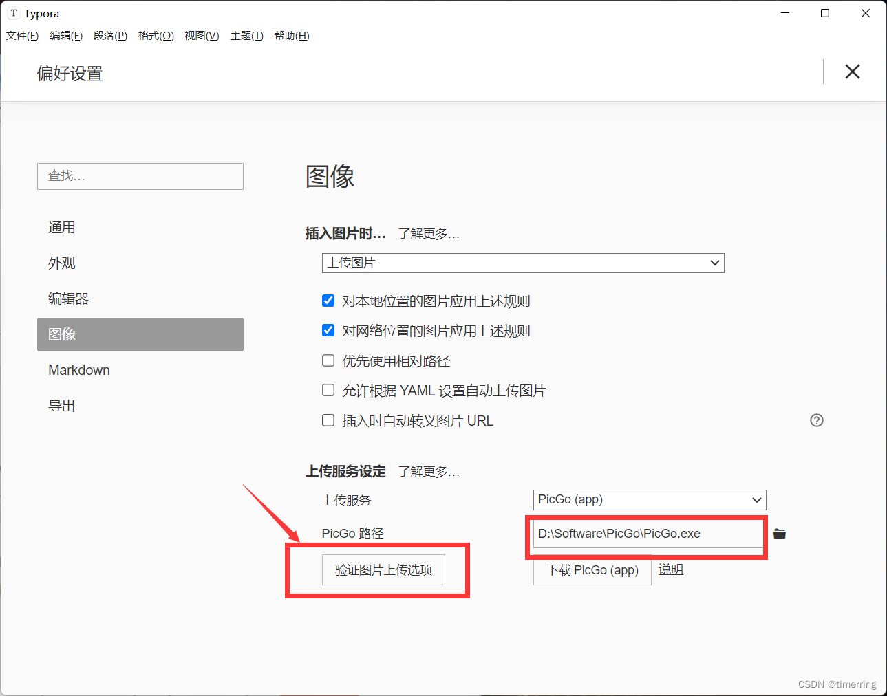 6.然后设置为默认图床即可,我们可以在typora中点击验证图片上传选项查看是否配置成功。
