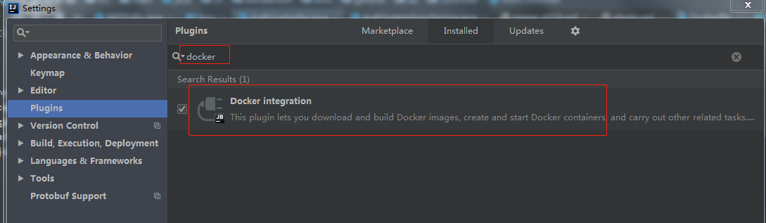 打开File->Settings->Plugins,搜索Docker,可以看见Docker integration插件,安装提示进行一步步安装,安装完毕重启IEDA。