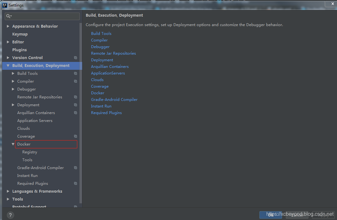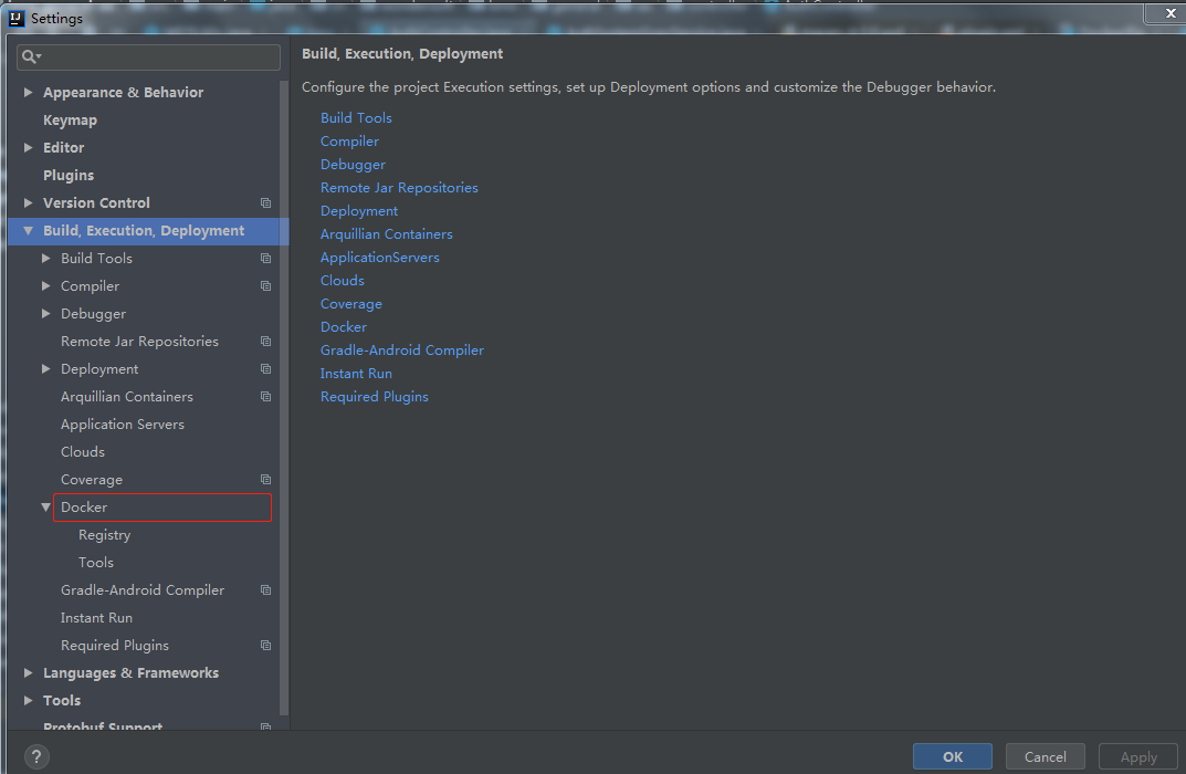 重启IDEA后,打开File->Settings->Build,Execution,Deployment,如果有Docker列表,则说明插件安装成功。
