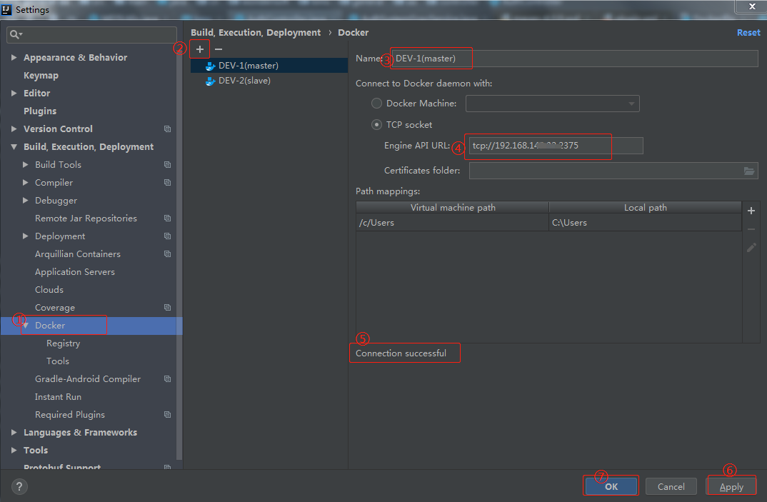 打开File->Settings->Build,Execution,Deployment->Docker,按照下图进行配置即可。