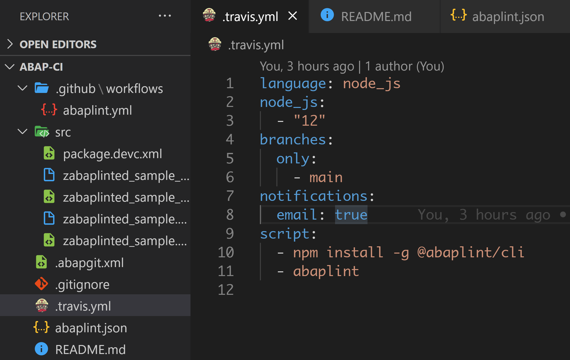 为了让我的 ABAP 代码仓库提交的代码能够被 Travis 抓取,我在项目根目录下创建了 .travis.yml 文件,内容如下图所示,其 script 区域的命令行和前文介绍的 abaplint.yml 内包含的内容完全一致,这里不再赘述。