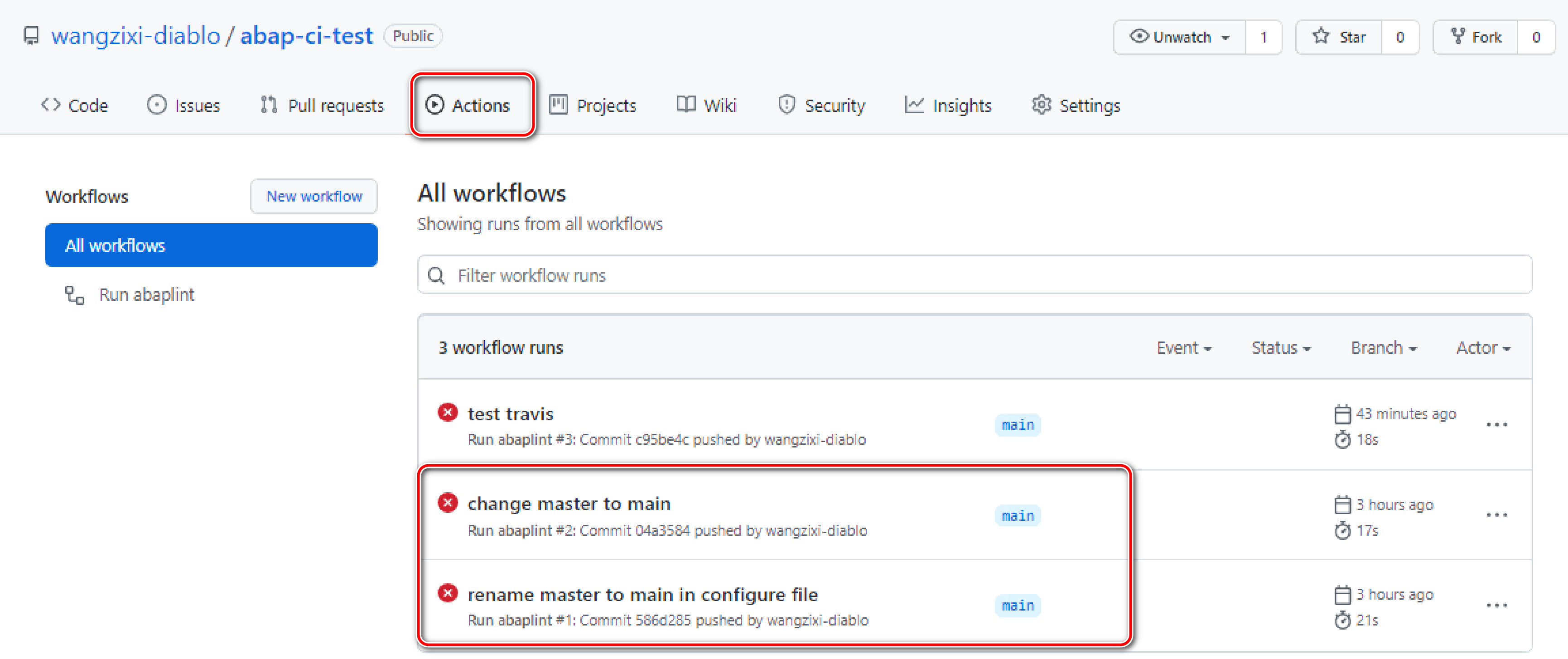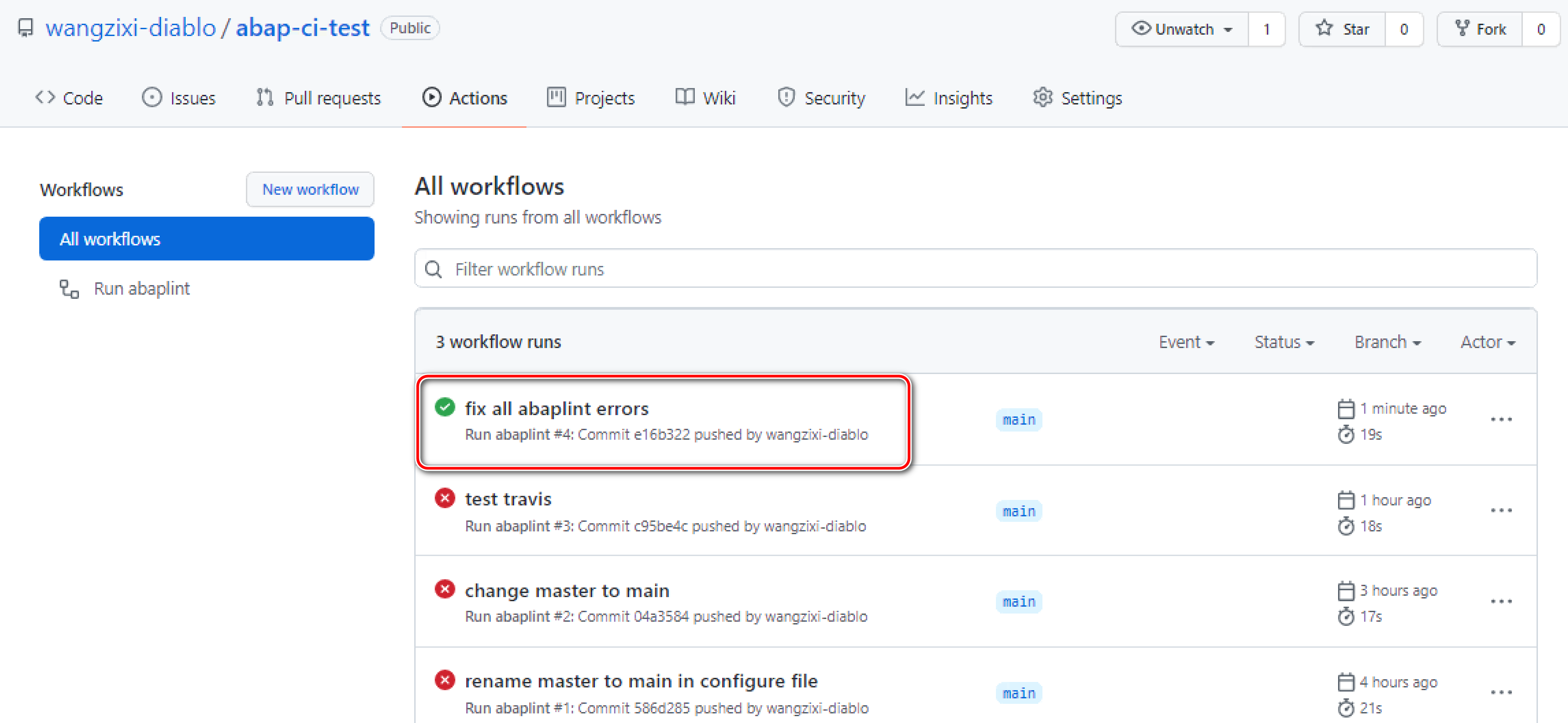 完成 abaplint.yml 和 abaplint.json 两个文件的创建之后,提交任意代码到 main 分支,即可在代码仓库的 Actions 标签页里,看到针对这些代码提交,自动执行的 abaplint 检测记录: