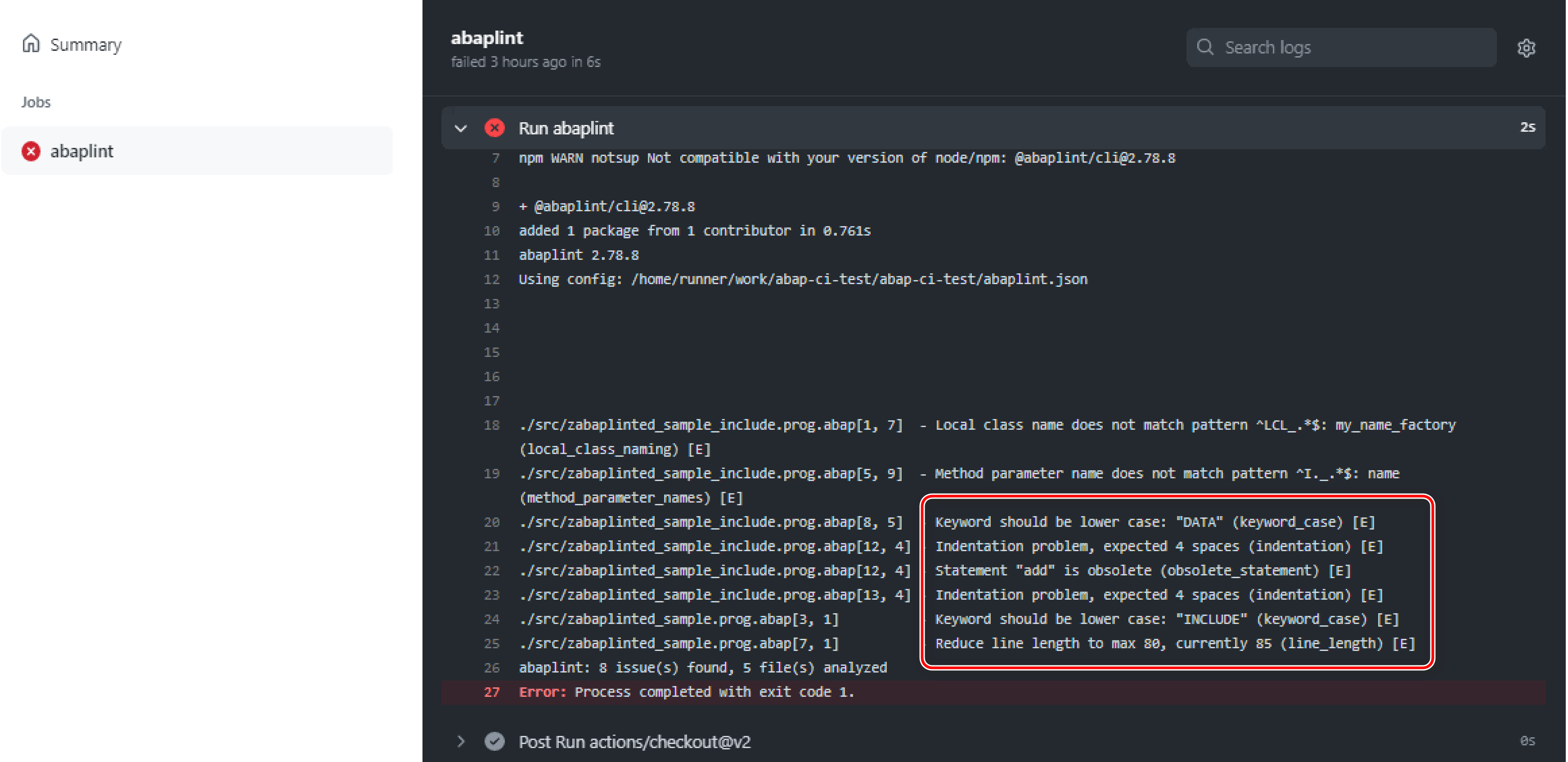 单击一条进去,能查看到引起当前工作流执行失败的原因——代码违反了我自定义的 abaplint 检测规则:定义的关键字需要小写,使用了被标注为 obsolete 的关键字 ADD 等等。