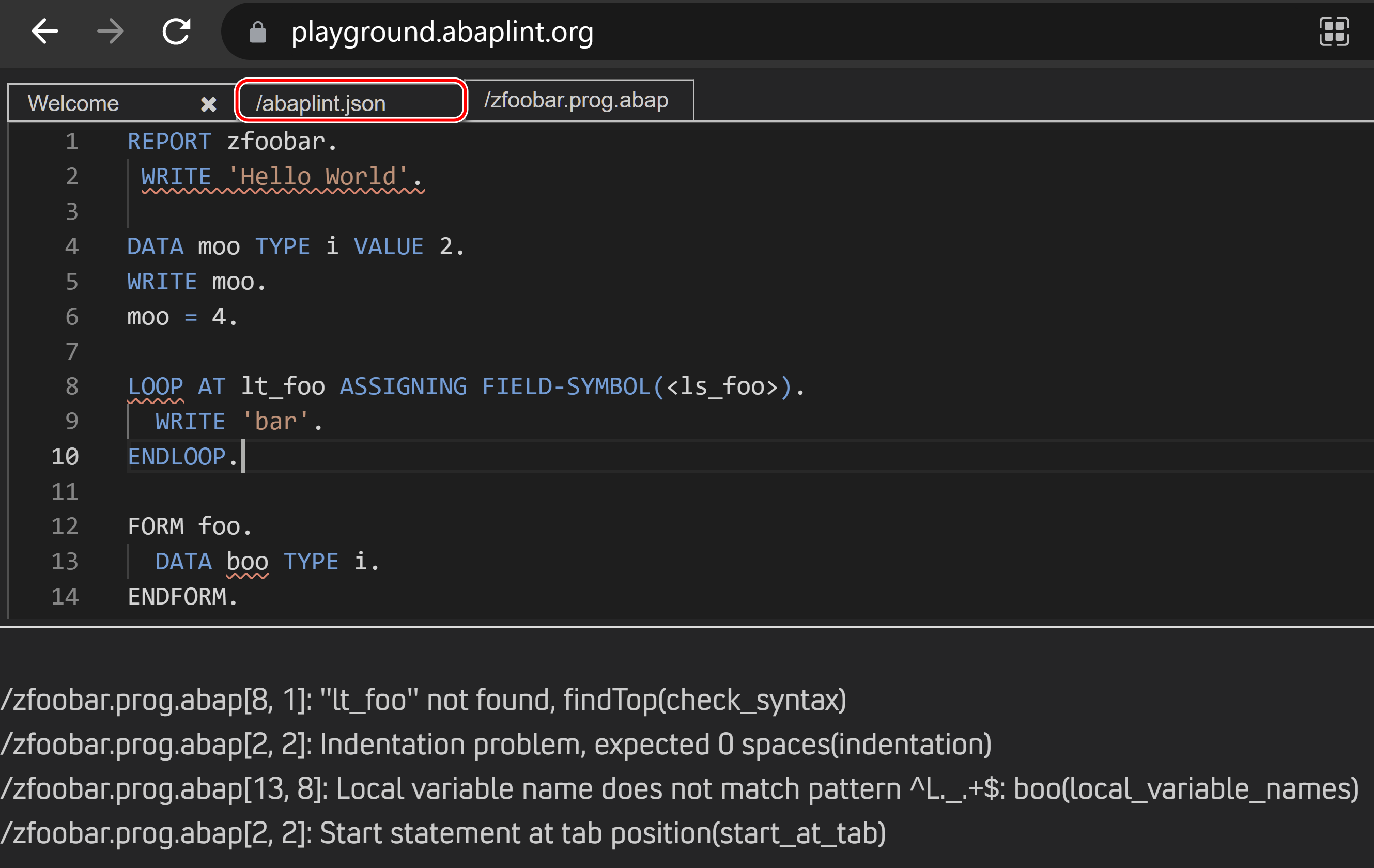 注意,abaplint 对代码的检测和 ABAP 服务器上的代码语法检查(Syntax Check)完全是两回事。后者由位于 ABAP 内核的 Compiler 完成,而前者只是 TypeScript 实现的基于源代码文本级别的检测,abaplint 本身并不能从语法层面识别 ABAP 语言,只是机械地基于文本静态分析,完成 abaplint.json 里定义的检测任务而已。