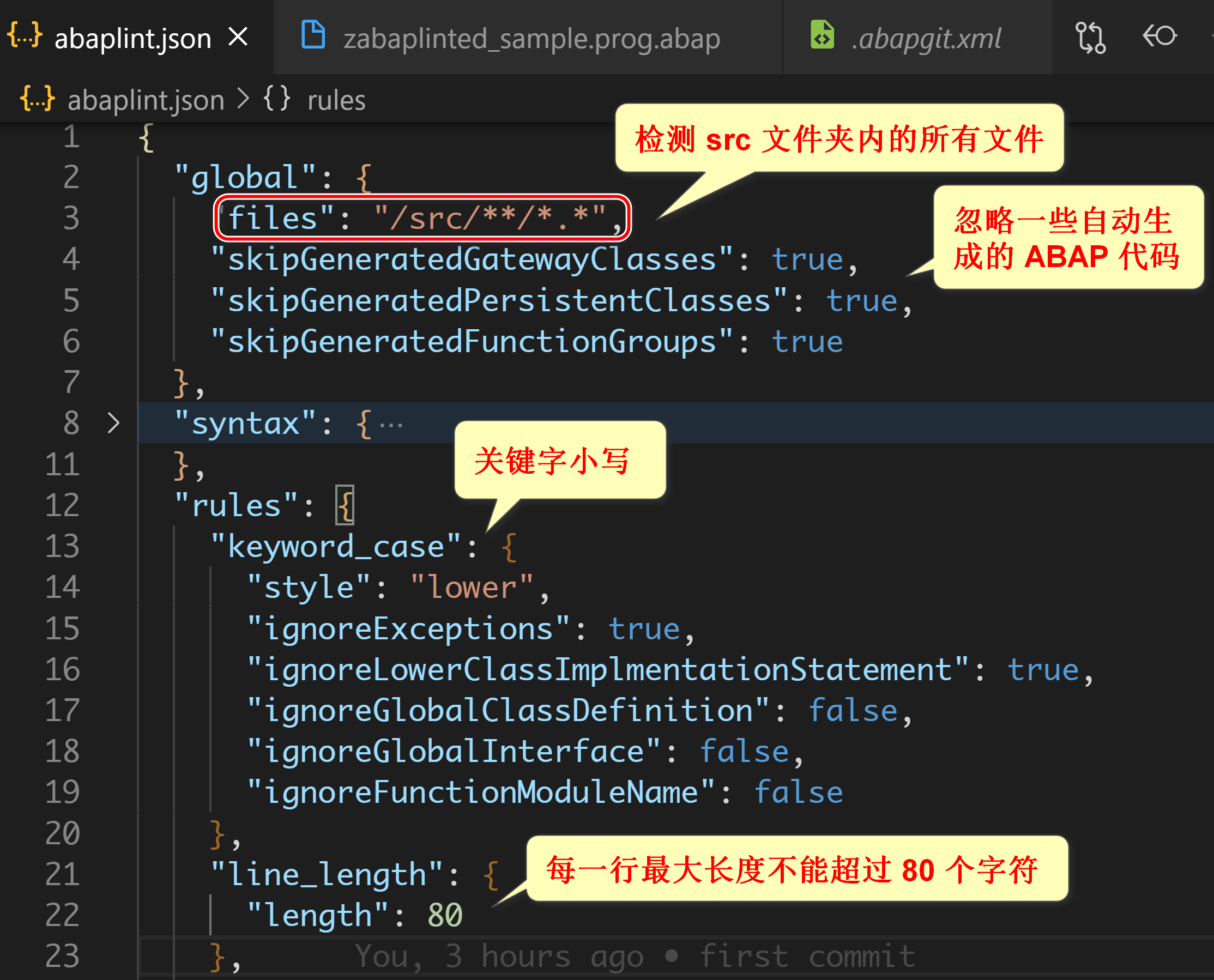 (2) 根目录下新建 abaplint.json,定义 ABAP 代码检测规则。为了演示起见,我只启用了如下图所示的几条简单规则。关于 abaplint.json 支持的所有检测规则,请查阅这个链接: