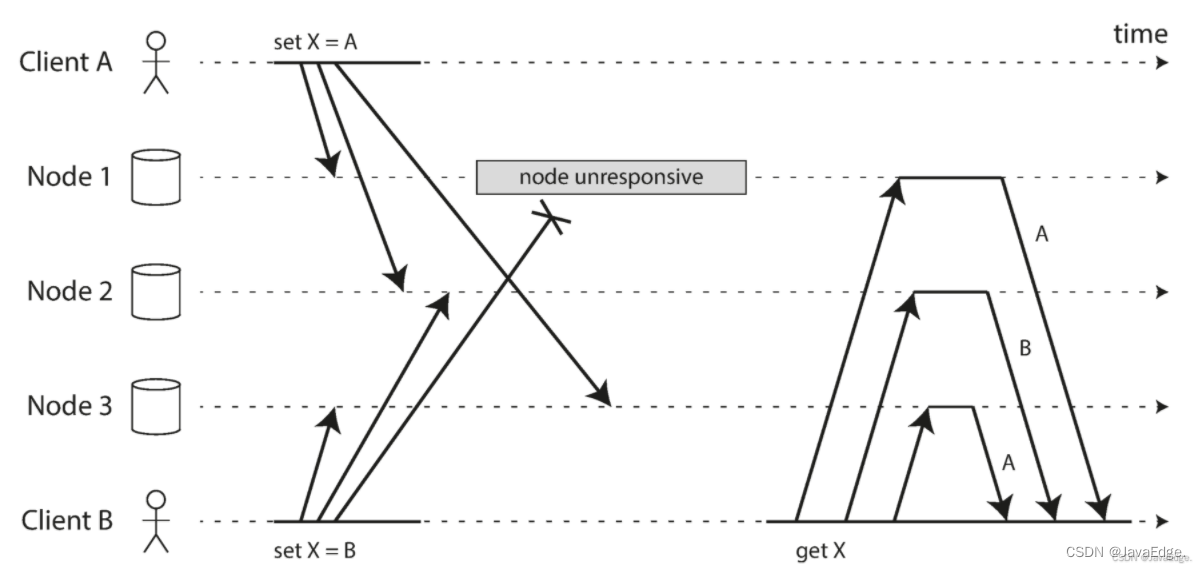 如下图中的两个写入是并发:每个客户端启动写操作时,并不知道另一个客户端是否也在执行操作同样的K。因此,操作之间不存在因果关系
