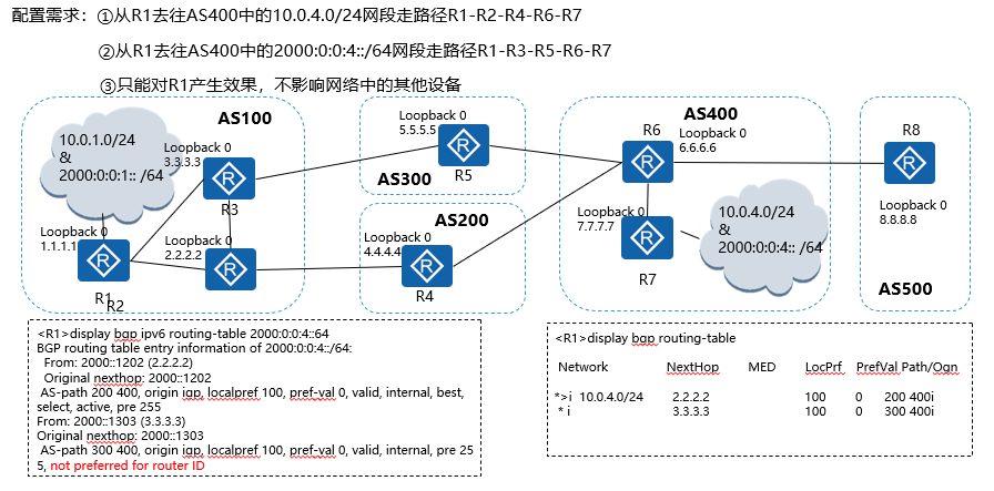 配置:BGP视图下:[R2-bgp]default Local_Preference 200 //配置本路由器默认的本地优先级