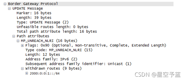 MP-unreach-NRLI:只携带撤销的路由条目(BGP 4+用该属性撤销路由)(Type Code= 15 )