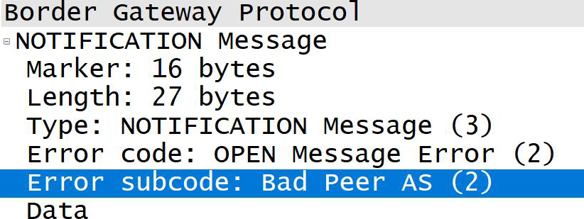 如果收到错误的Update或Keepalive报文,那么BGP发送Notification报文通知对端,并转至Idle状态