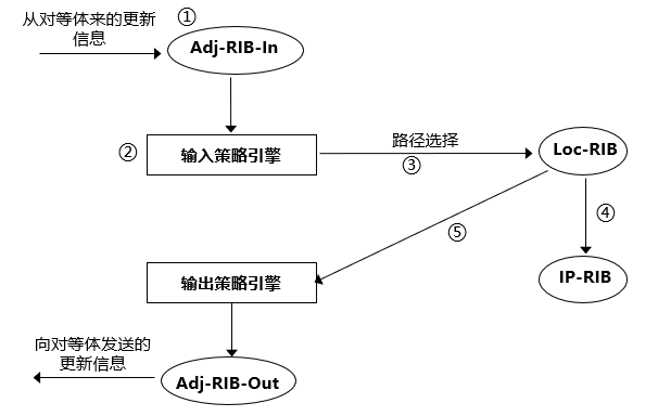 (1)当从对等体接收到更新数据包时,路由器会把这些更新数据包存储到路由选择信息库(Routing Information Base, RIB)中,并指明是来自哪个对等体的(Adj-RIB-In)。这些更新数据包被输入策略引擎过滤后,路由器将会执行路径选择算法,来为每一条前缀确定最佳路径