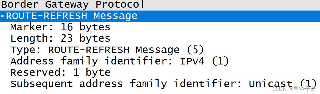 5.Route-Refresh报文:用于在改变路由策略后请求对等体重新发送路由信息